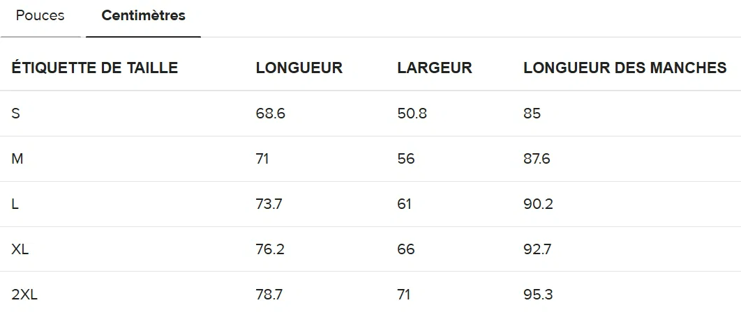 Guide des tailles :