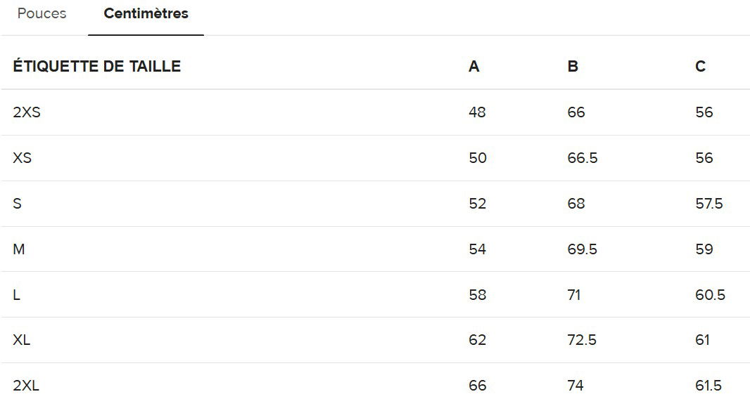 • Guide des tailles :