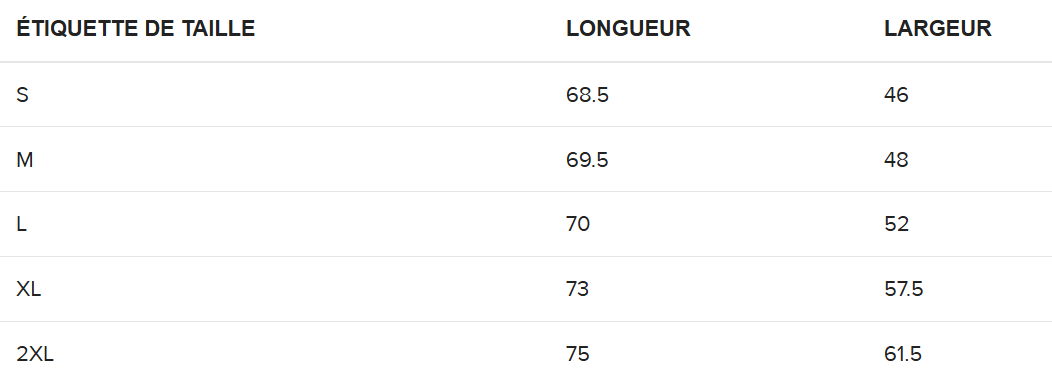 Guide des tailles :